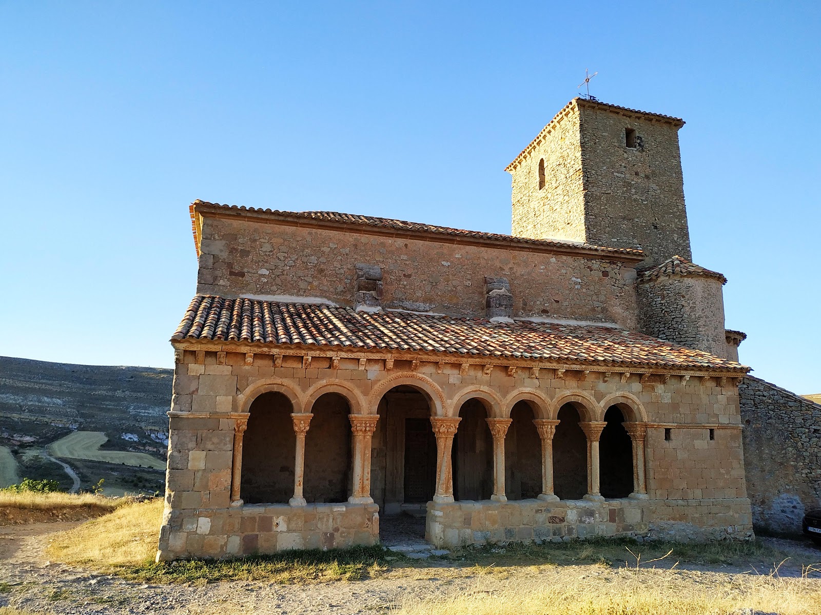Inicialmente era una nave con ábside y presbiterio, pero se le adoso una galería porticada de 9 arcos (en la dirección del castillo), algunos de estos han desaparecido como se ve en la fotografía sólo perduran siete. Según se ve la iglesia a la izquierda faltan dos arcos.